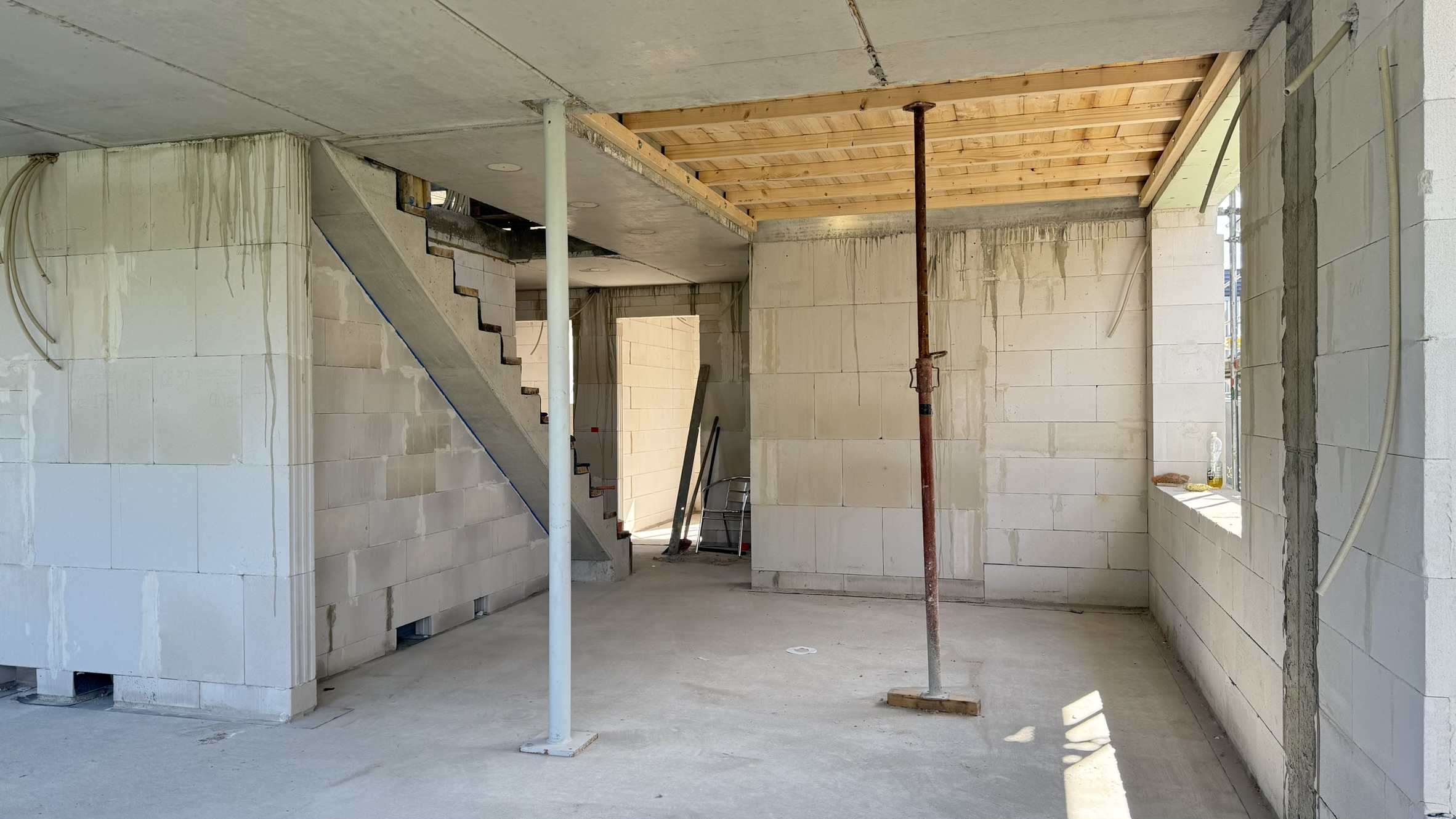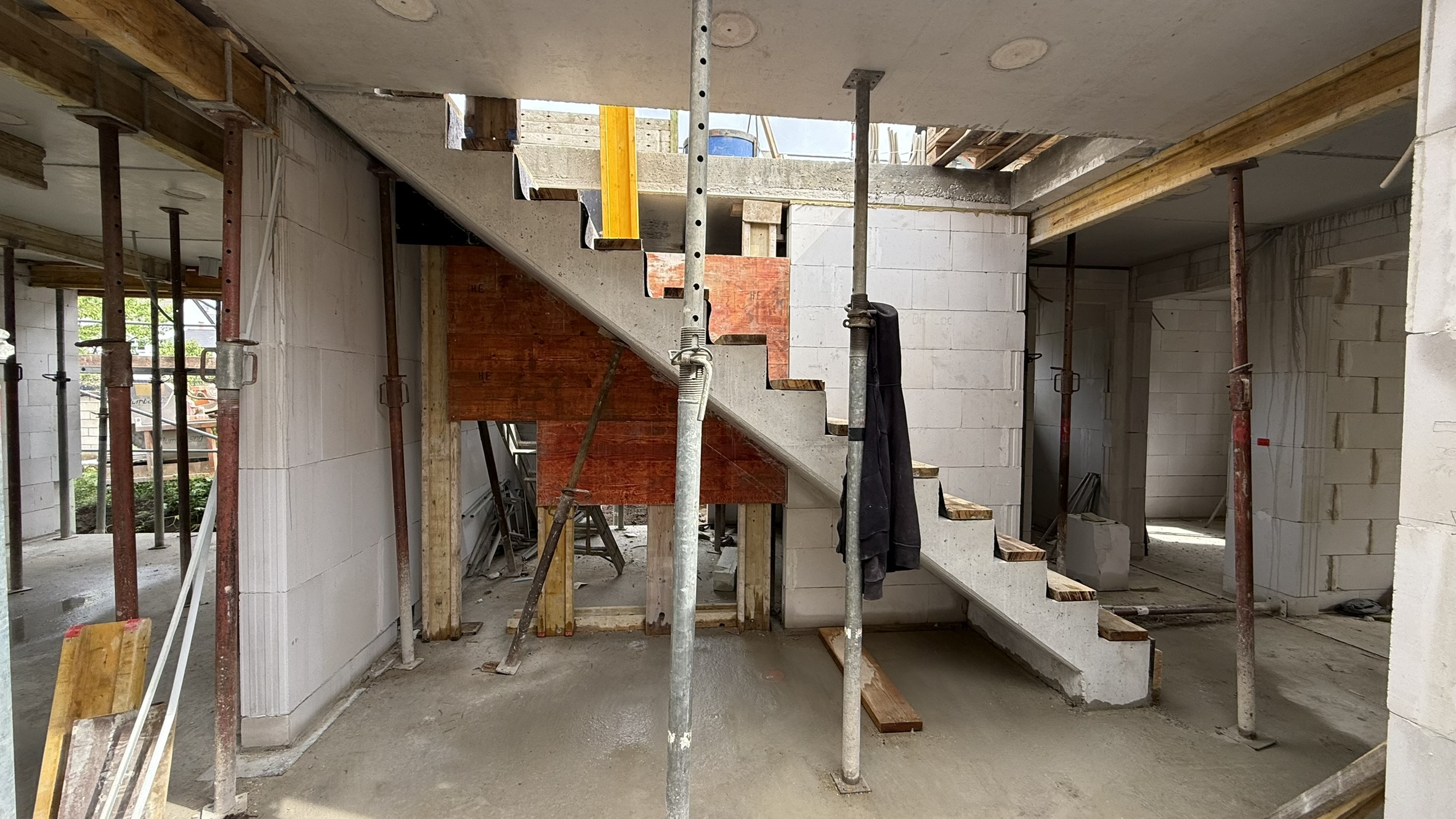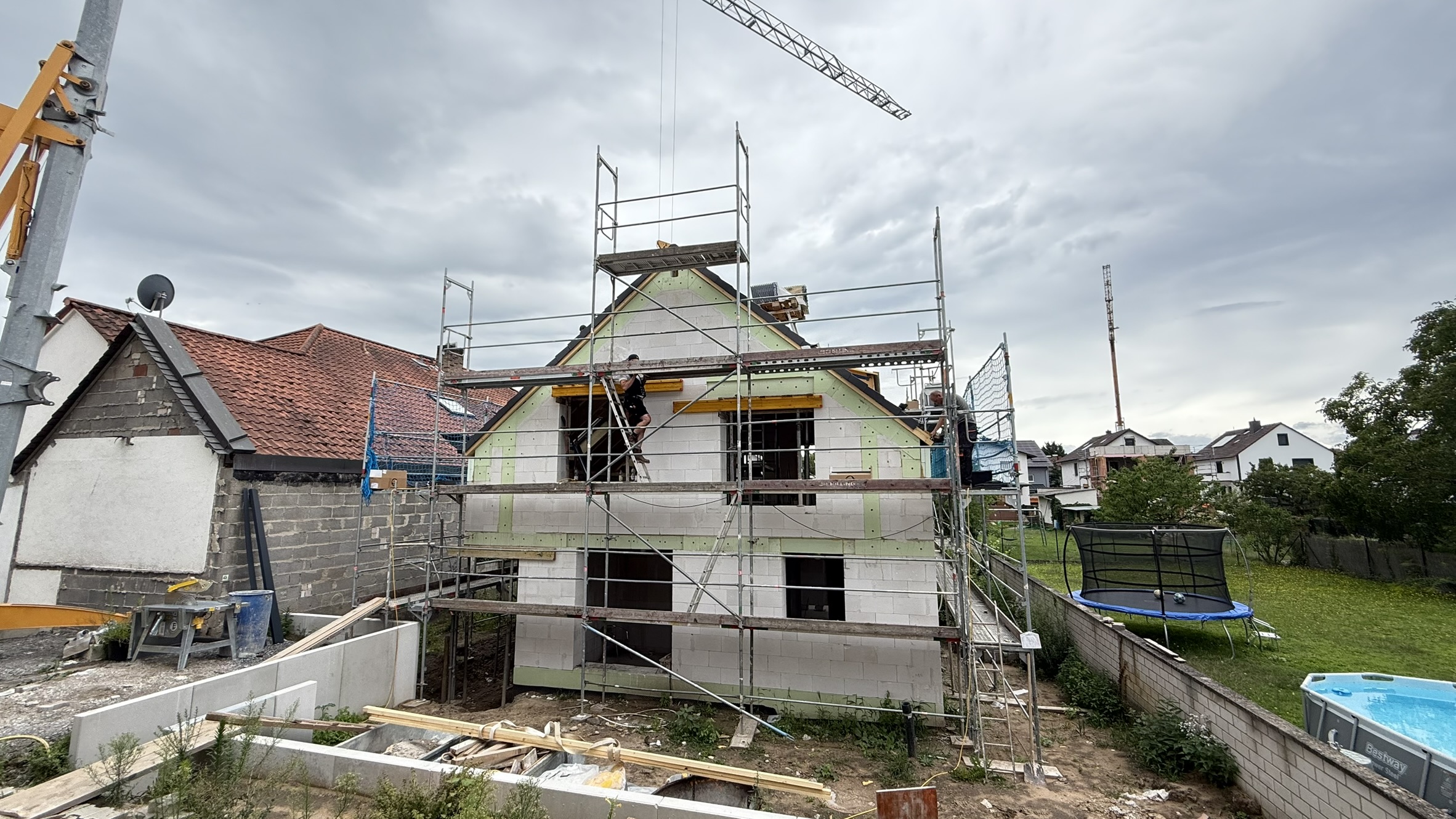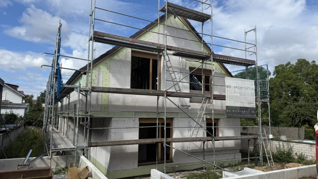 In einem bestehenden, typisch südhessischen Wohngebiet mit Siedlungshäusern und länglich großzügigen Grundstücken entsteht in zweiter Reihe ein modernes Einfamilienhaus.