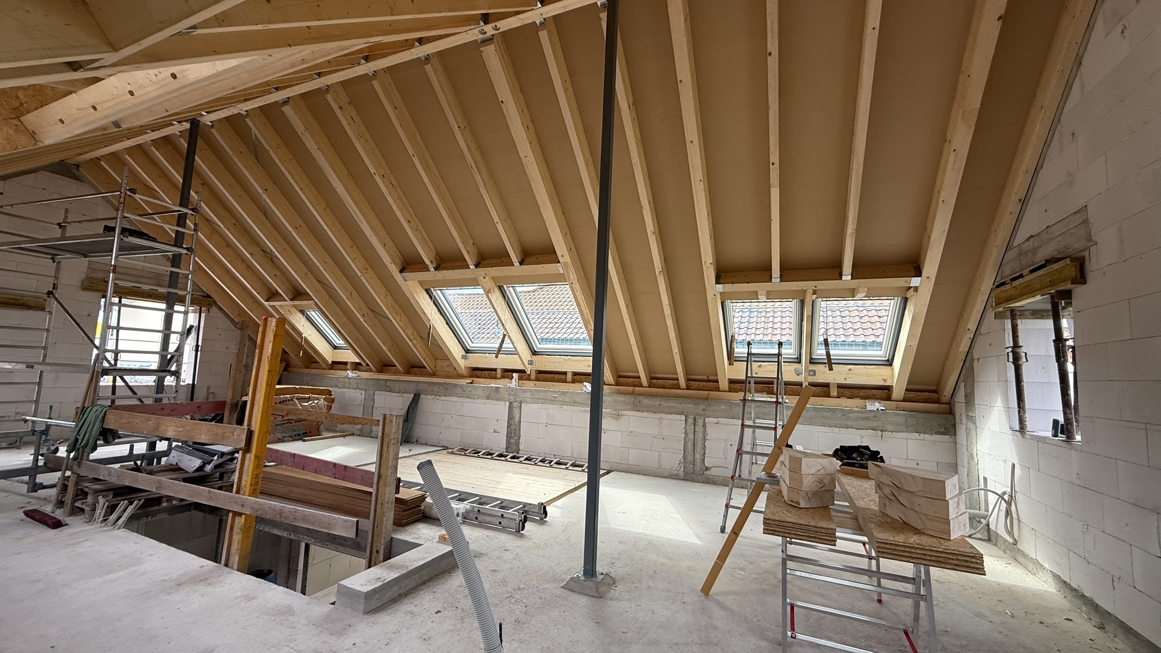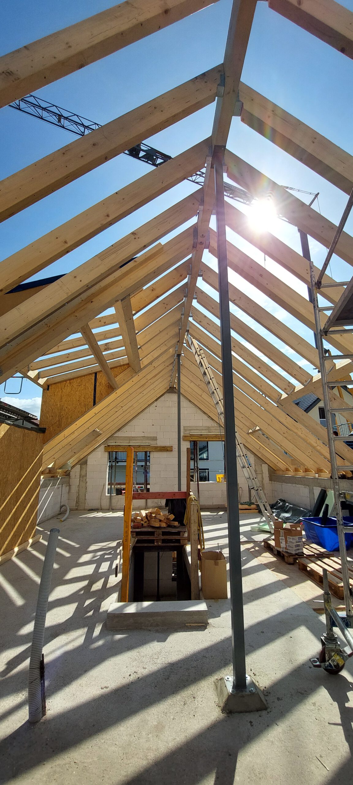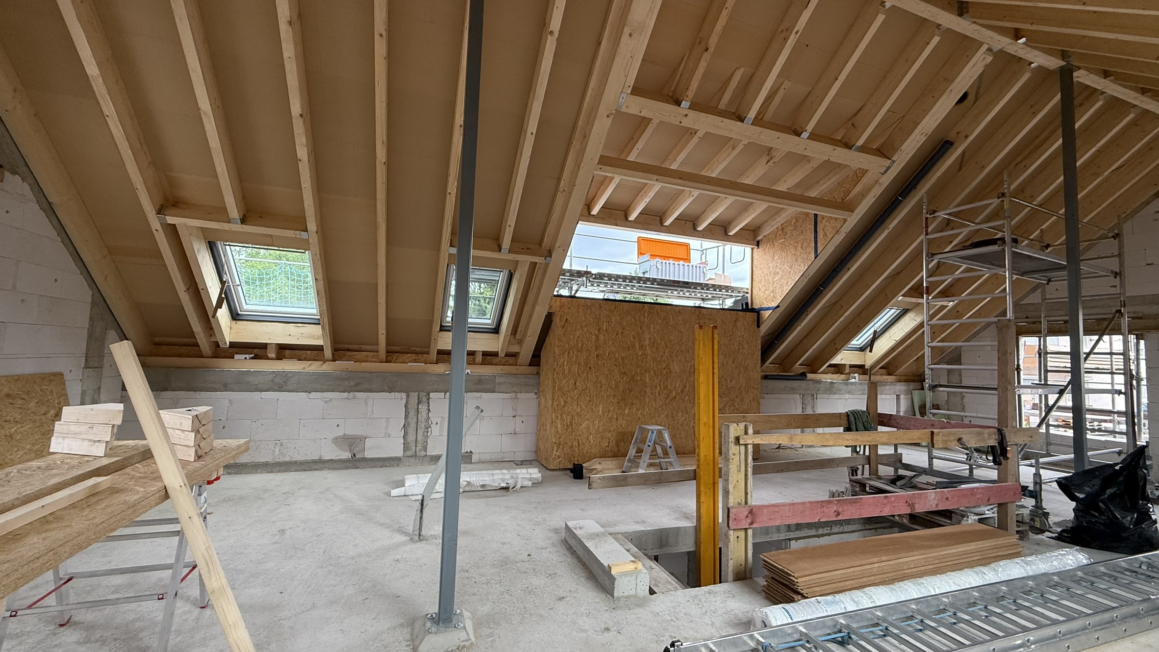 Im Inneren sorgt ein durchdachter Grundriss für ein funktionales Zuhause, das Platz für eine fünfköpfige Familie bietet. Für eine offene und luftige Atmosphäre sorgt ein Luftraum über dem Wohnbereich, der die beiden Etagen bis unter die Dachschräge verbindet.