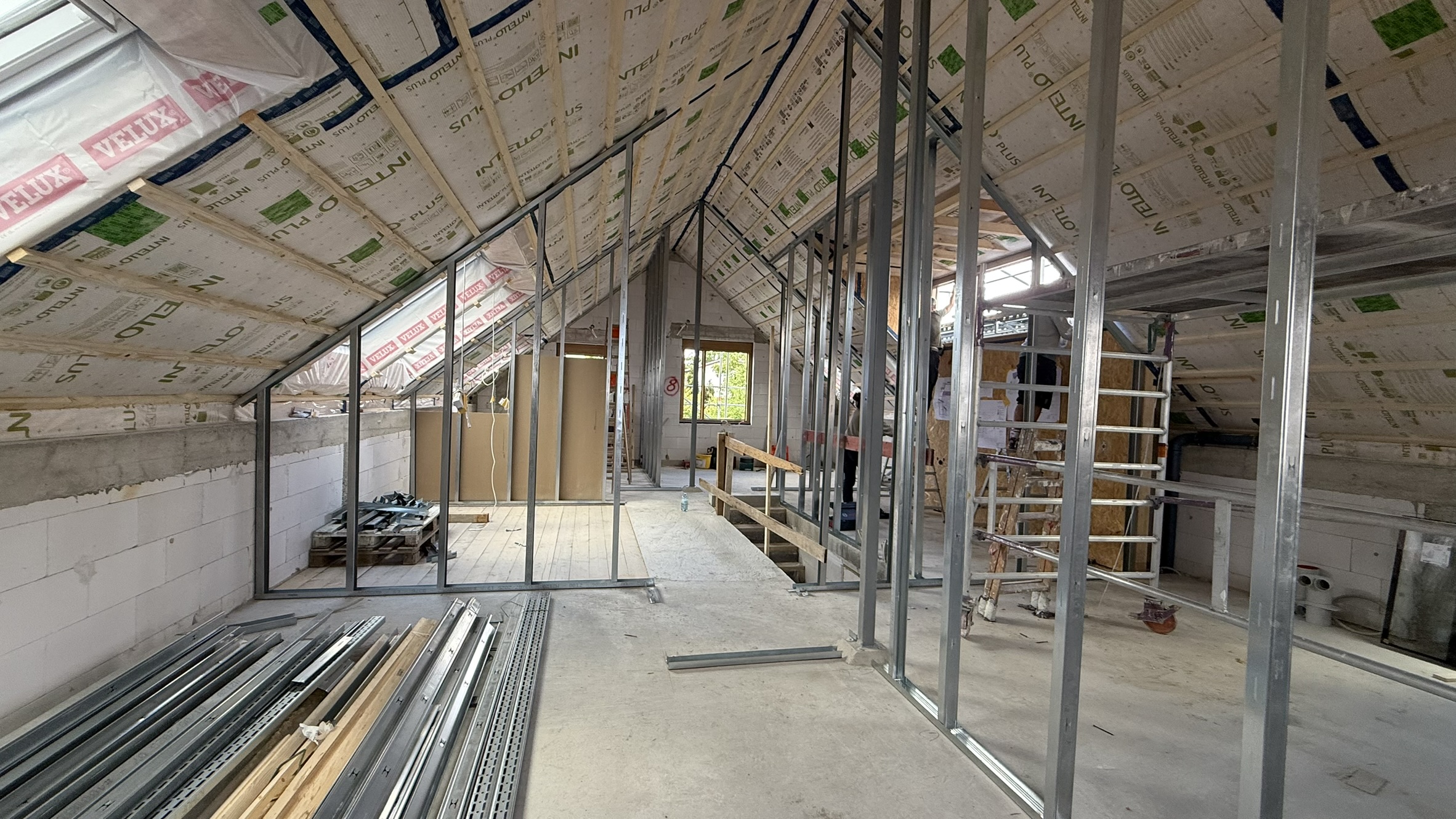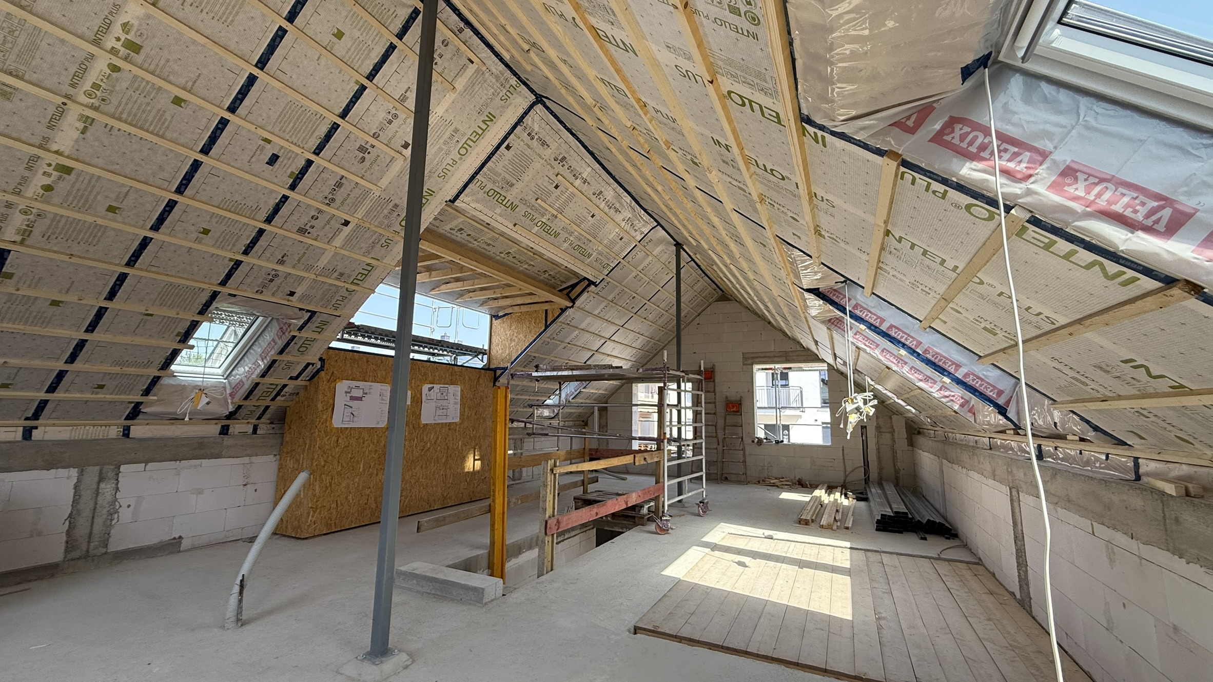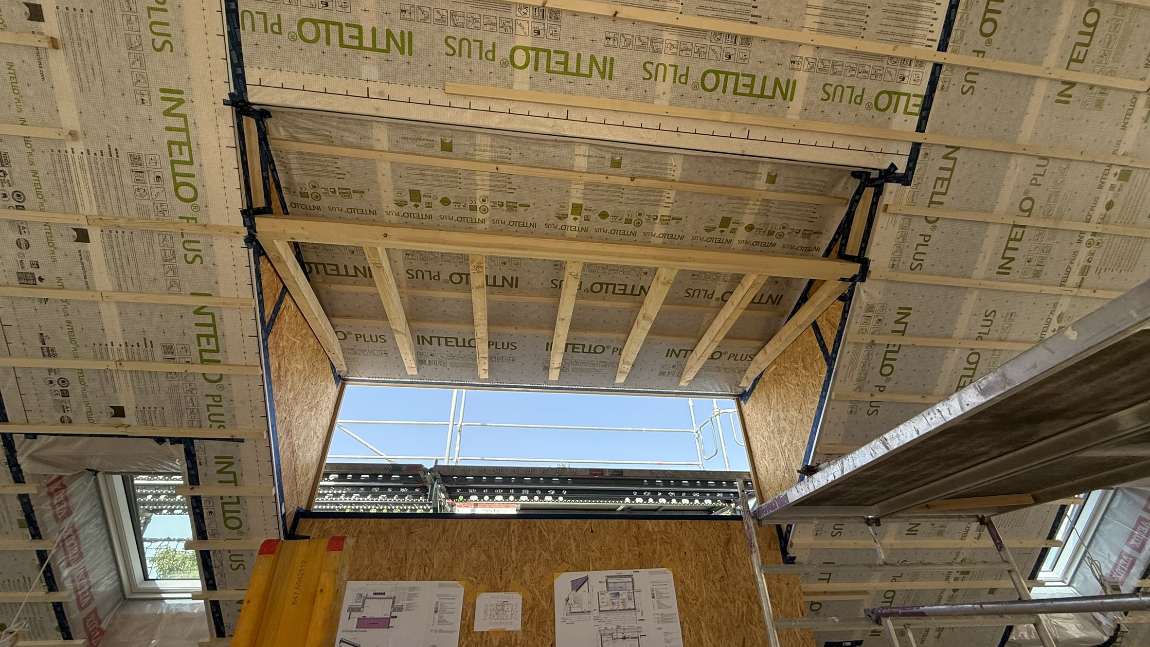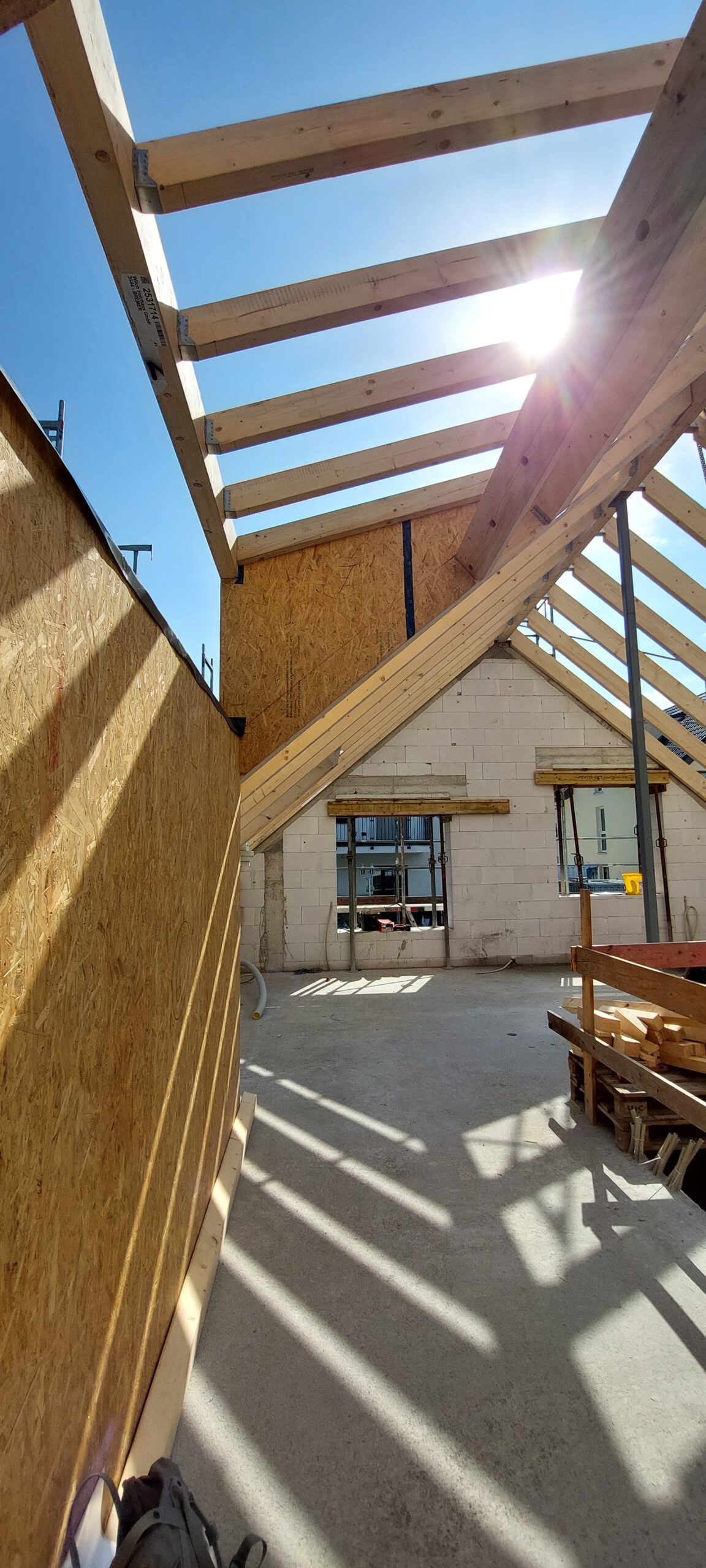 Im Inneren sorgt ein durchdachter Grundriss für ein funktionales Zuhause, das Platz für eine fünfköpfige Familie bietet. Für eine offene und luftige Atmosphäre sorgt ein Luftraum über dem Wohnbereich, der die beiden Etagen bis unter die Dachschräge verbindet.