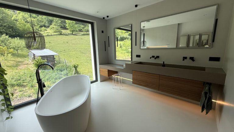 Das offene und fließende Innenraumkonzept schafft eine helle, freundliche Wohnatmosphäre. Die Wohnräume sind mit eleganten Gussböden gestaltet, während die Schlafräume mit warmen Nussbaumdielen ausgestattet sind. Die fugenlosen Bäder sorgen für eine klare, wohnliche Eleganz.
